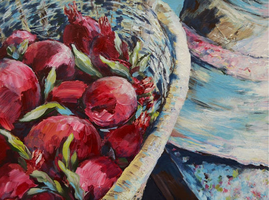 Pomegranate Harvest with Straw hat – framed canvas Print